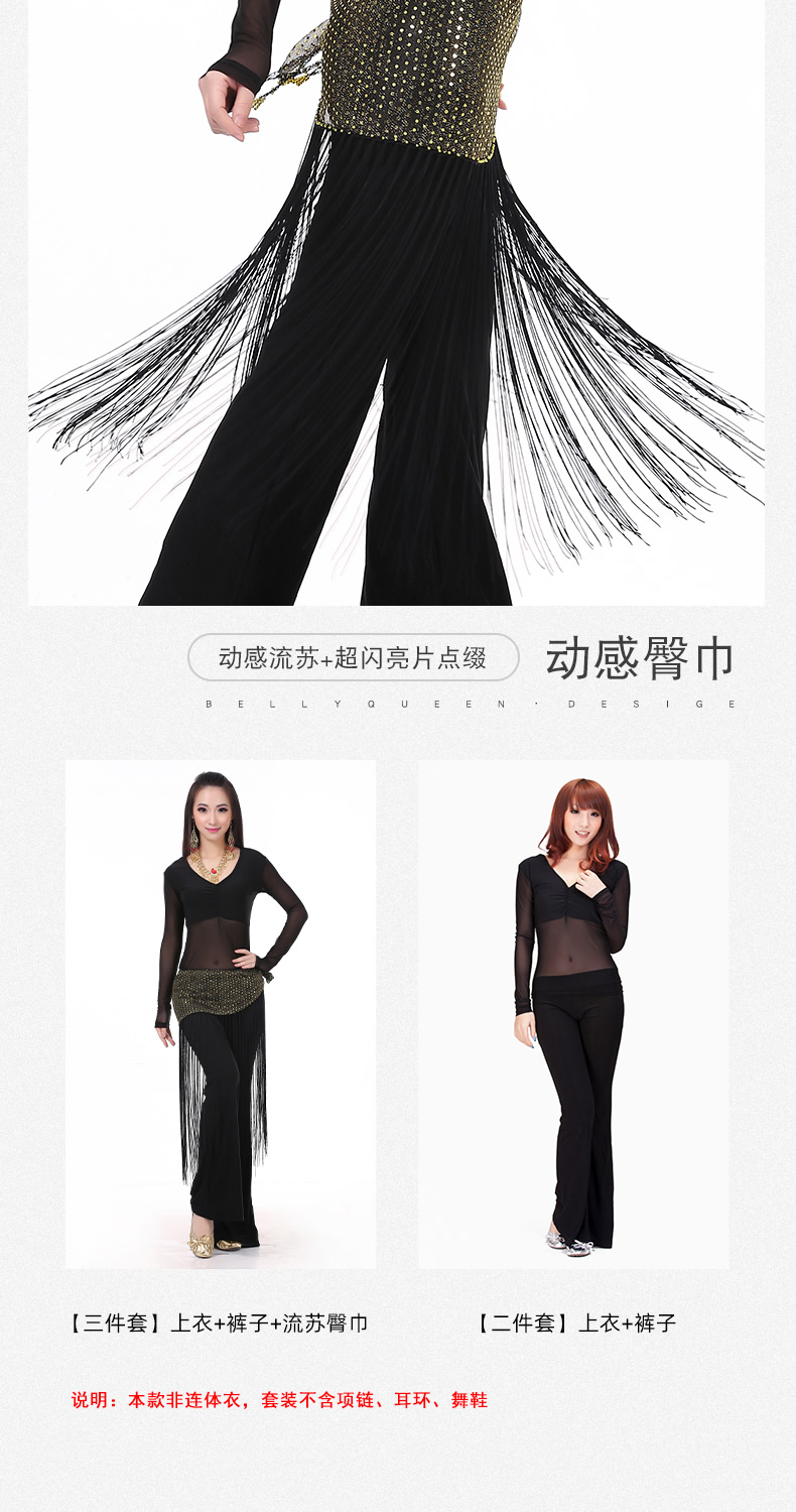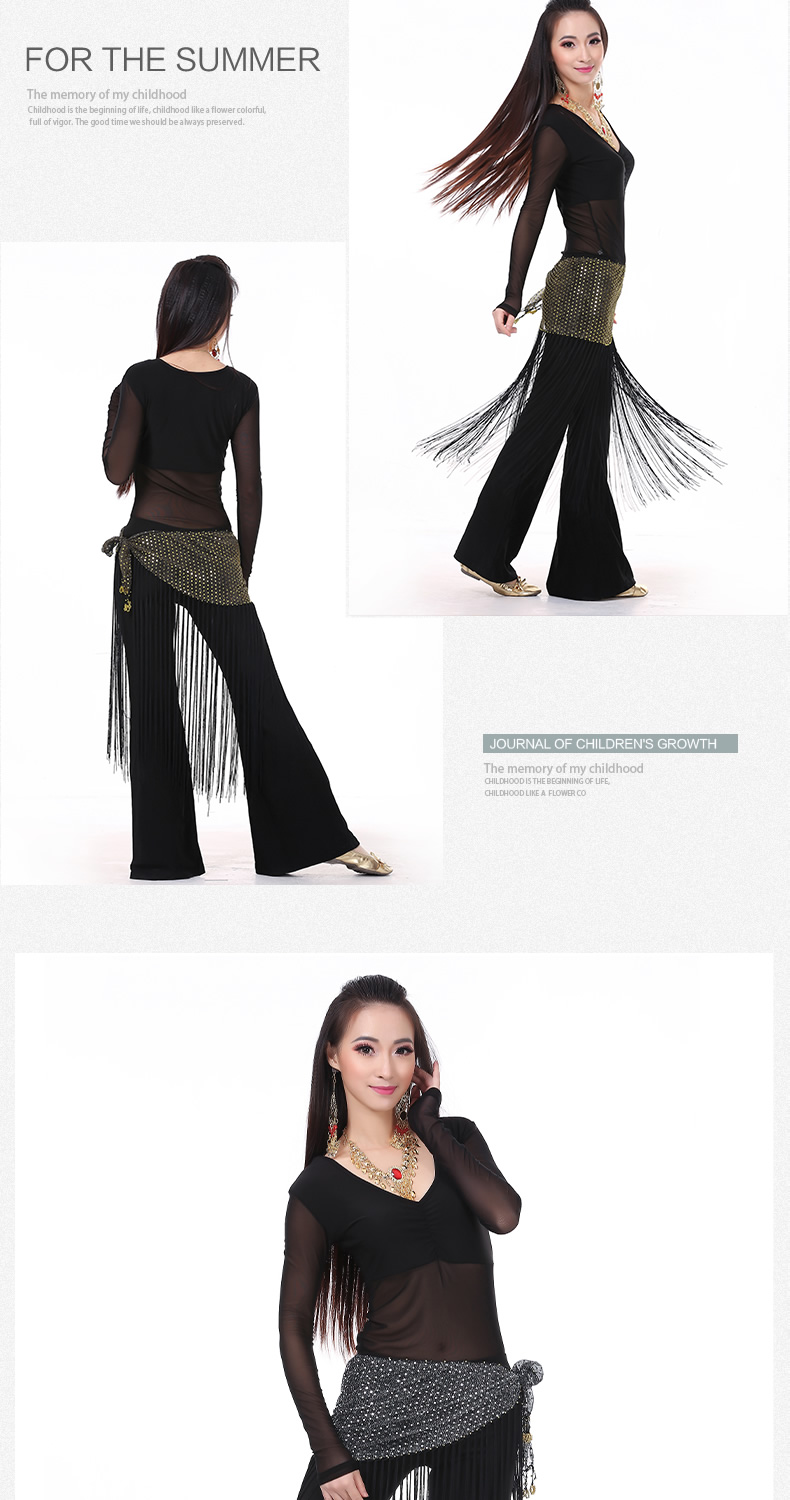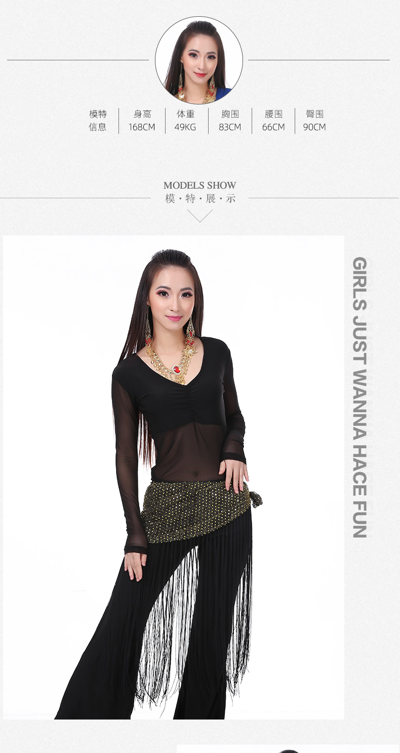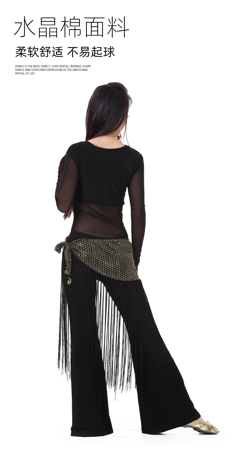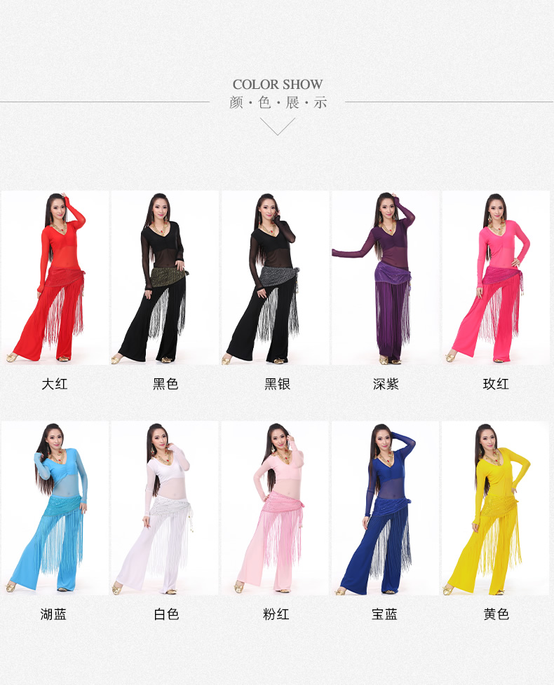 | 肚皮舞套装 >> 练习套装 >> 中皱半透纱长袖+练习裤+亮点流苏腰链(三件套) |