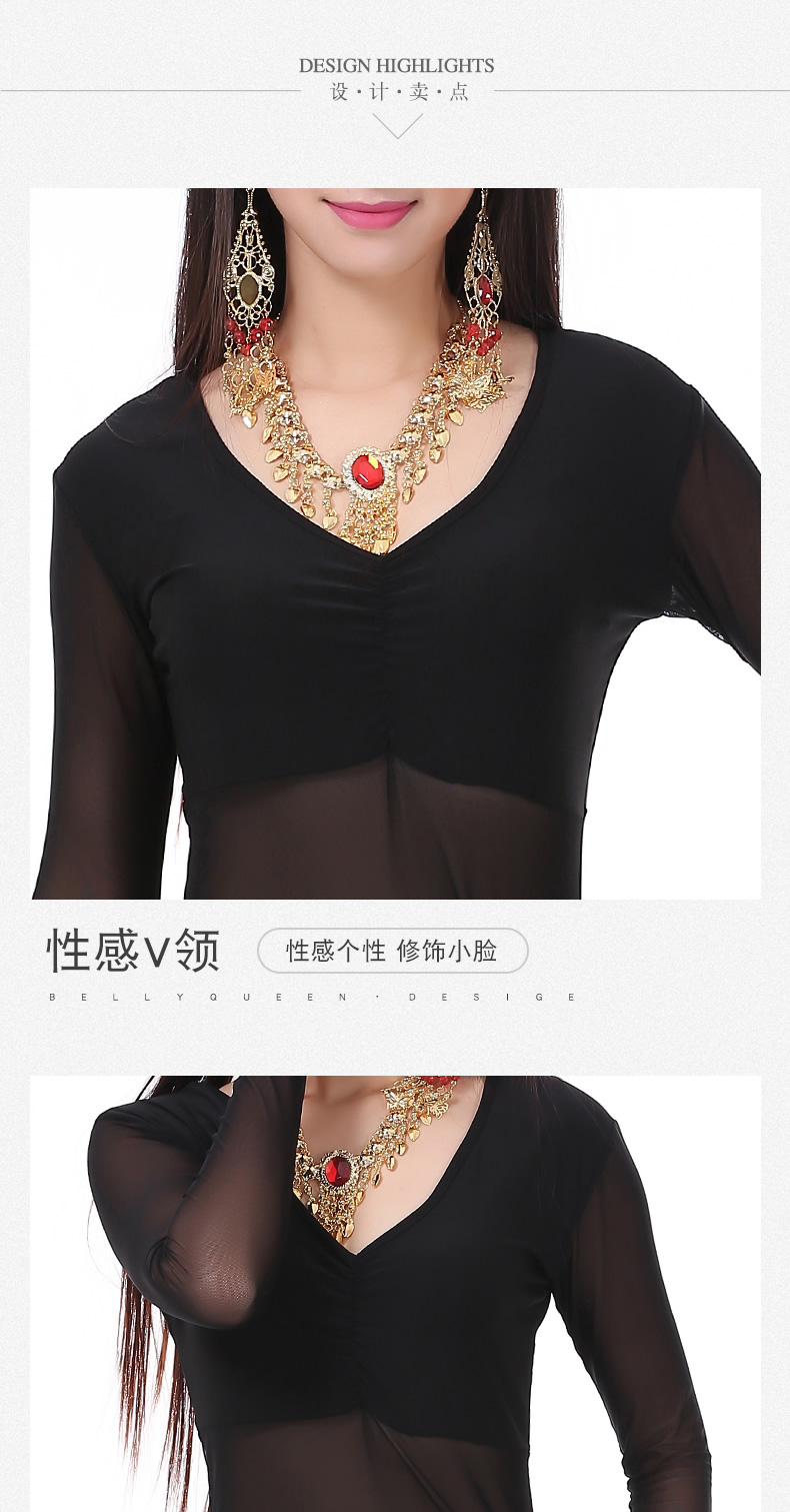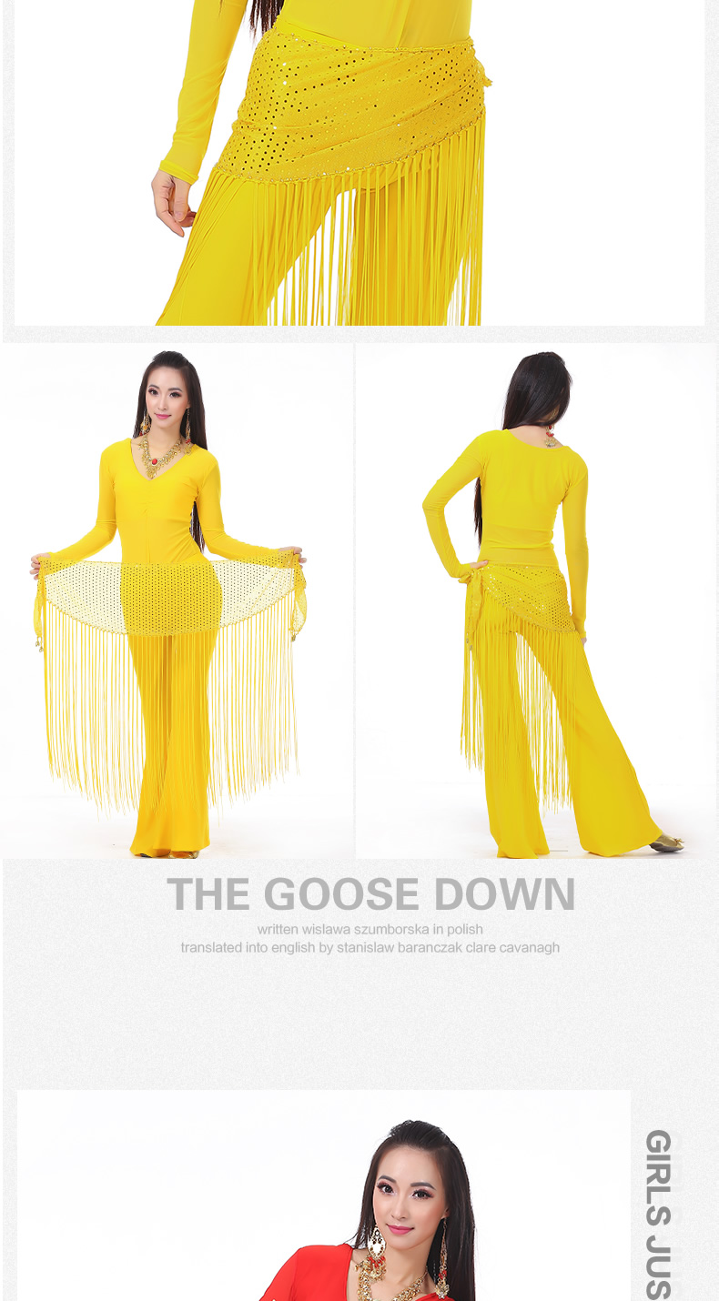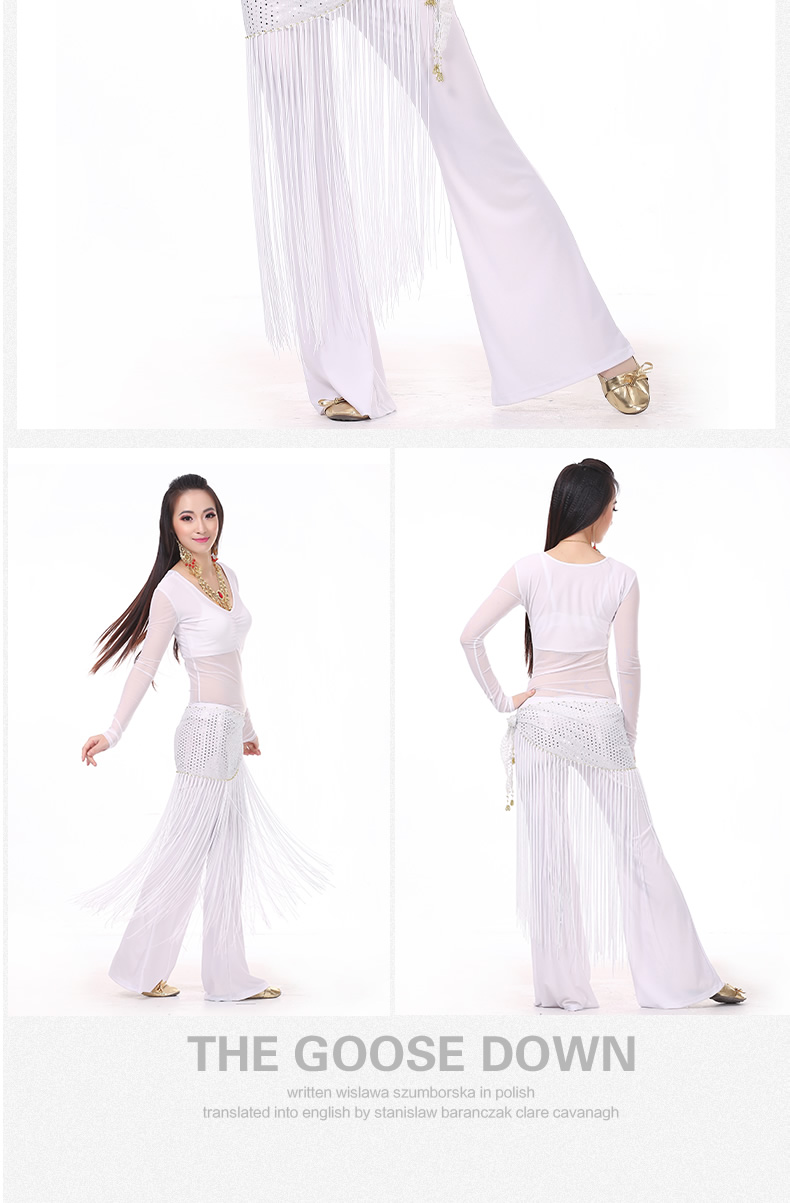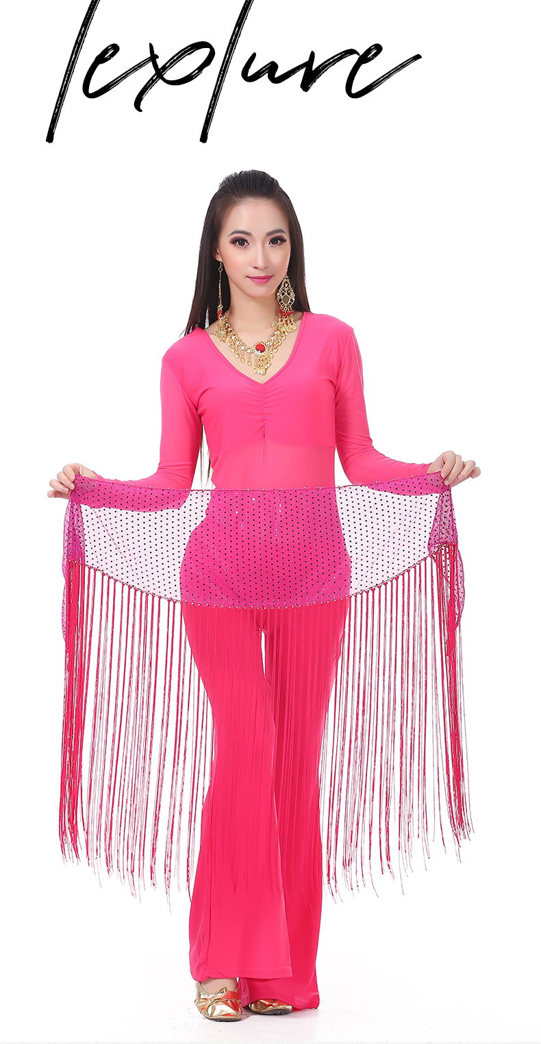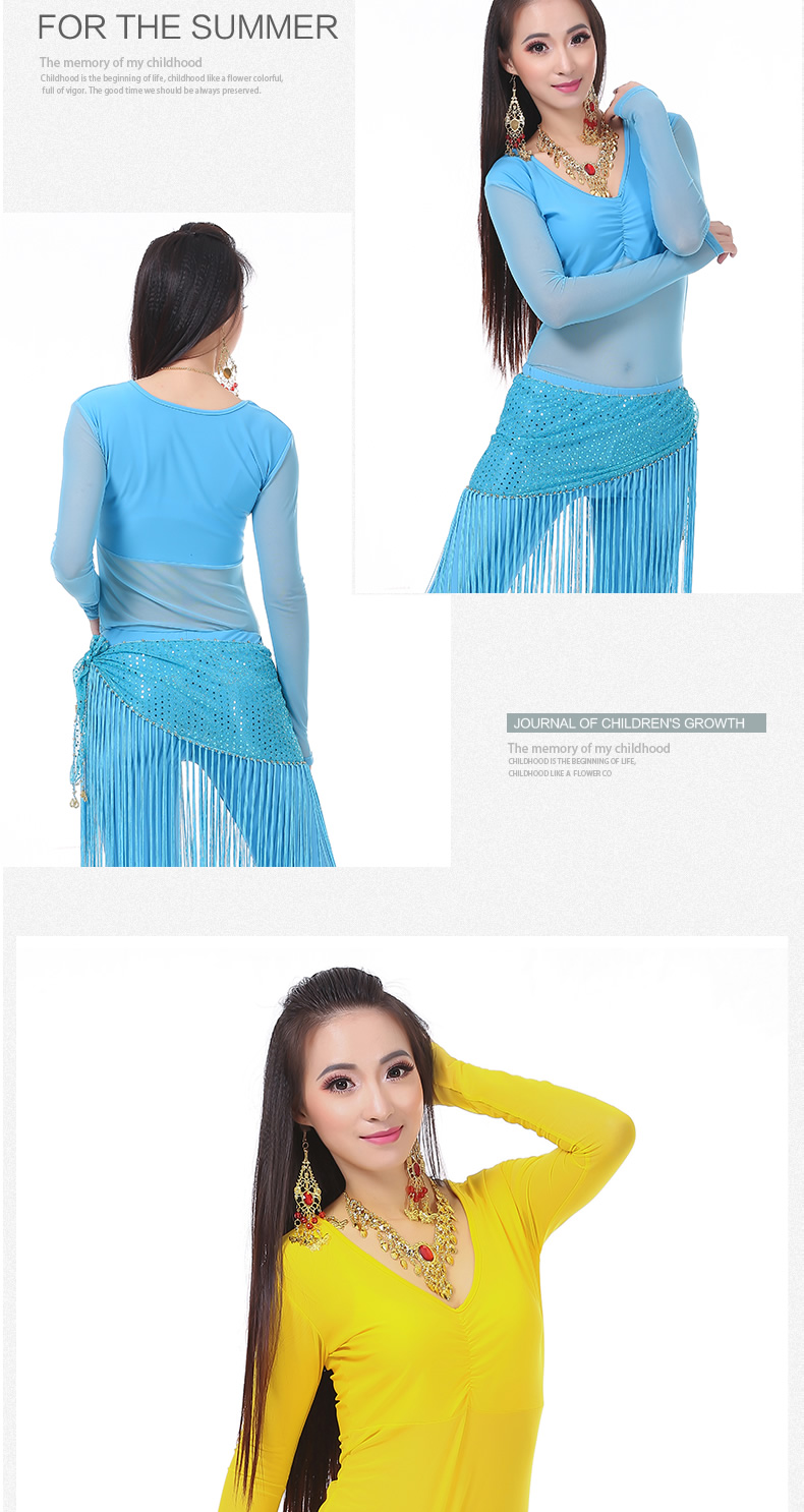| 肚皮舞套装 >> 练习套装 >> 中皱半透纱长袖+练习裤+亮点流苏腰链(三件套) |