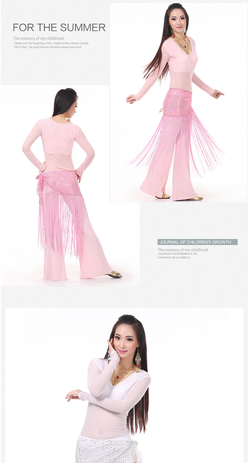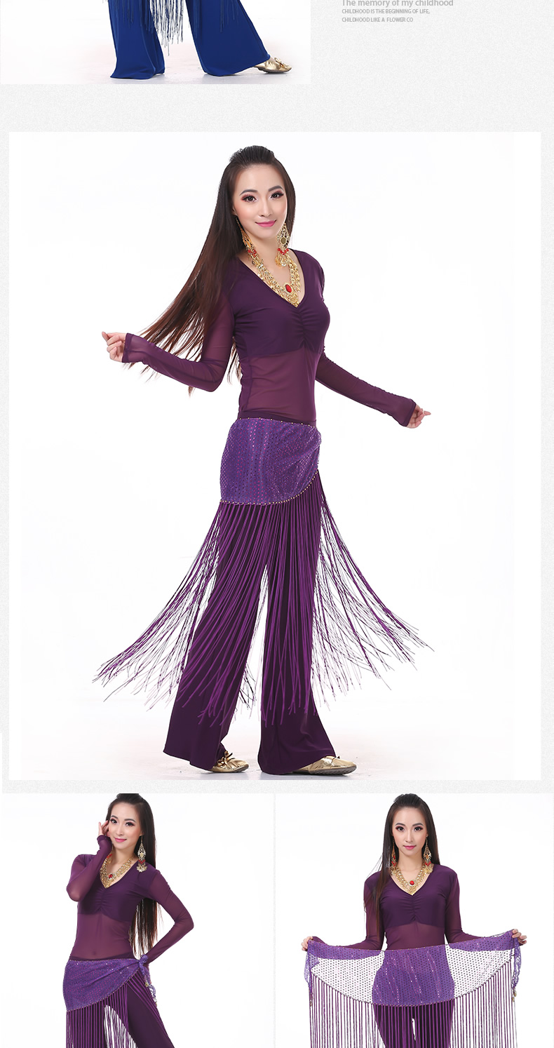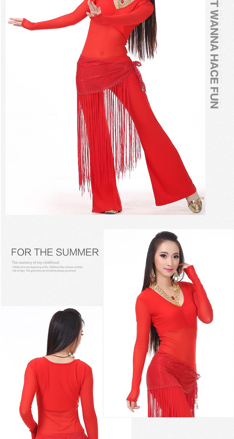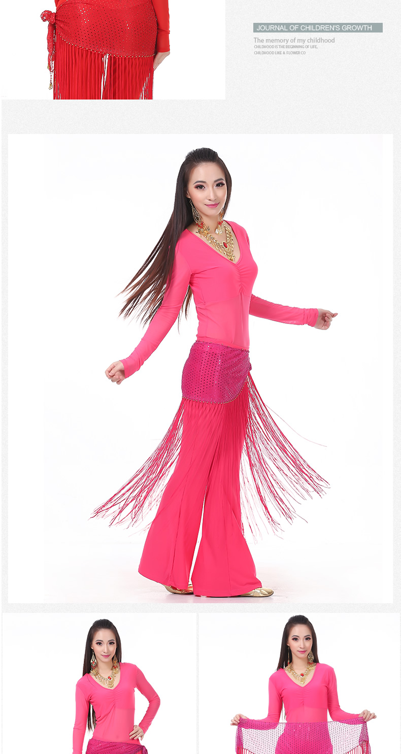 | 肚皮舞套装 >> 练习套装 >> 中皱半透纱长袖+练习裤+亮点流苏腰链(三件套) |