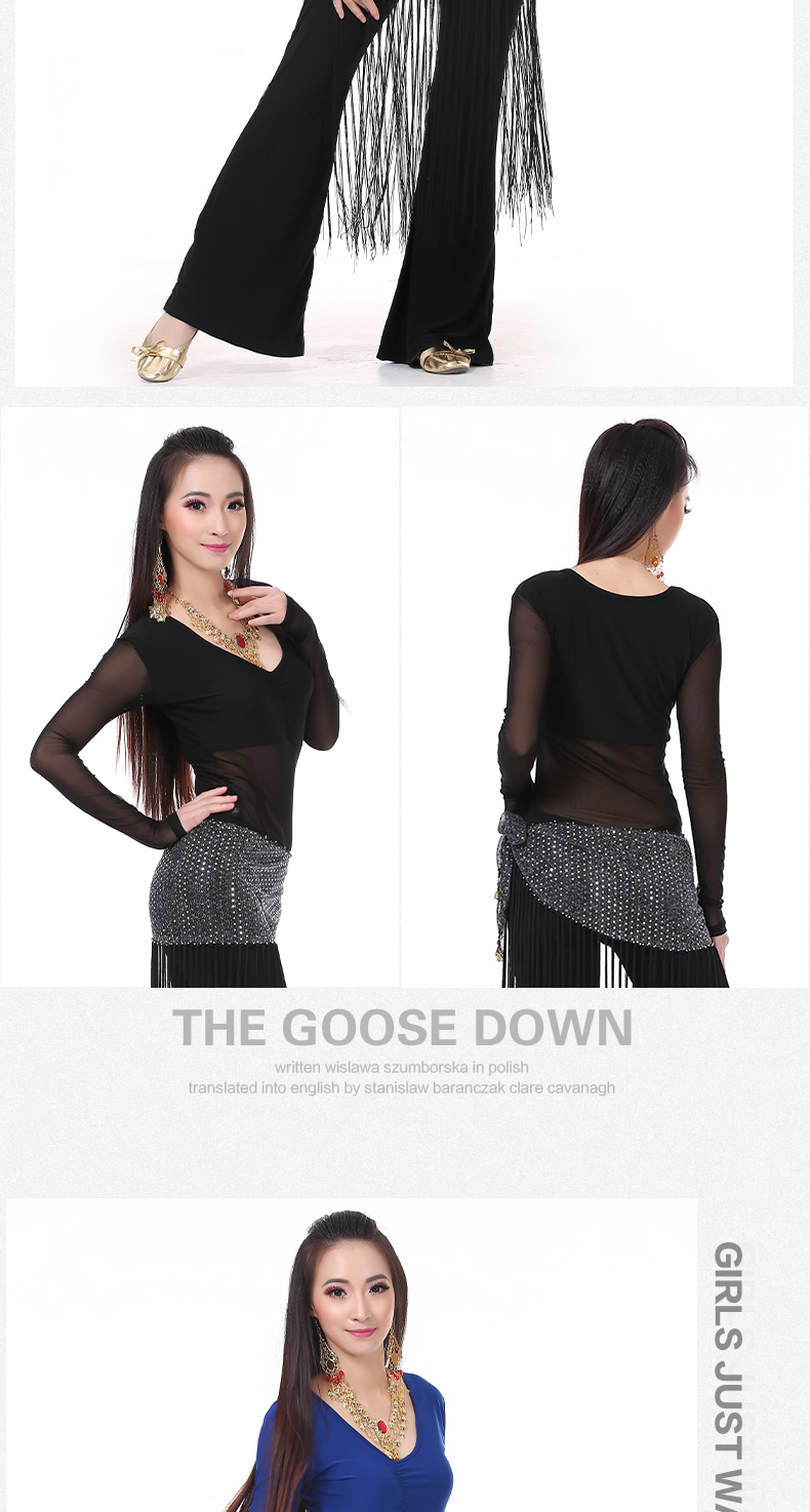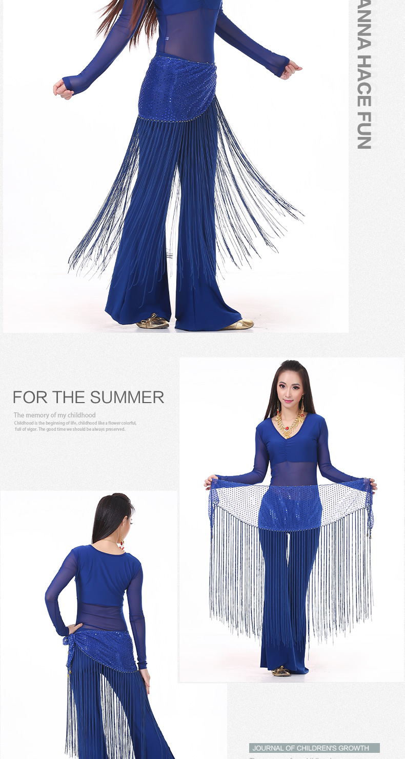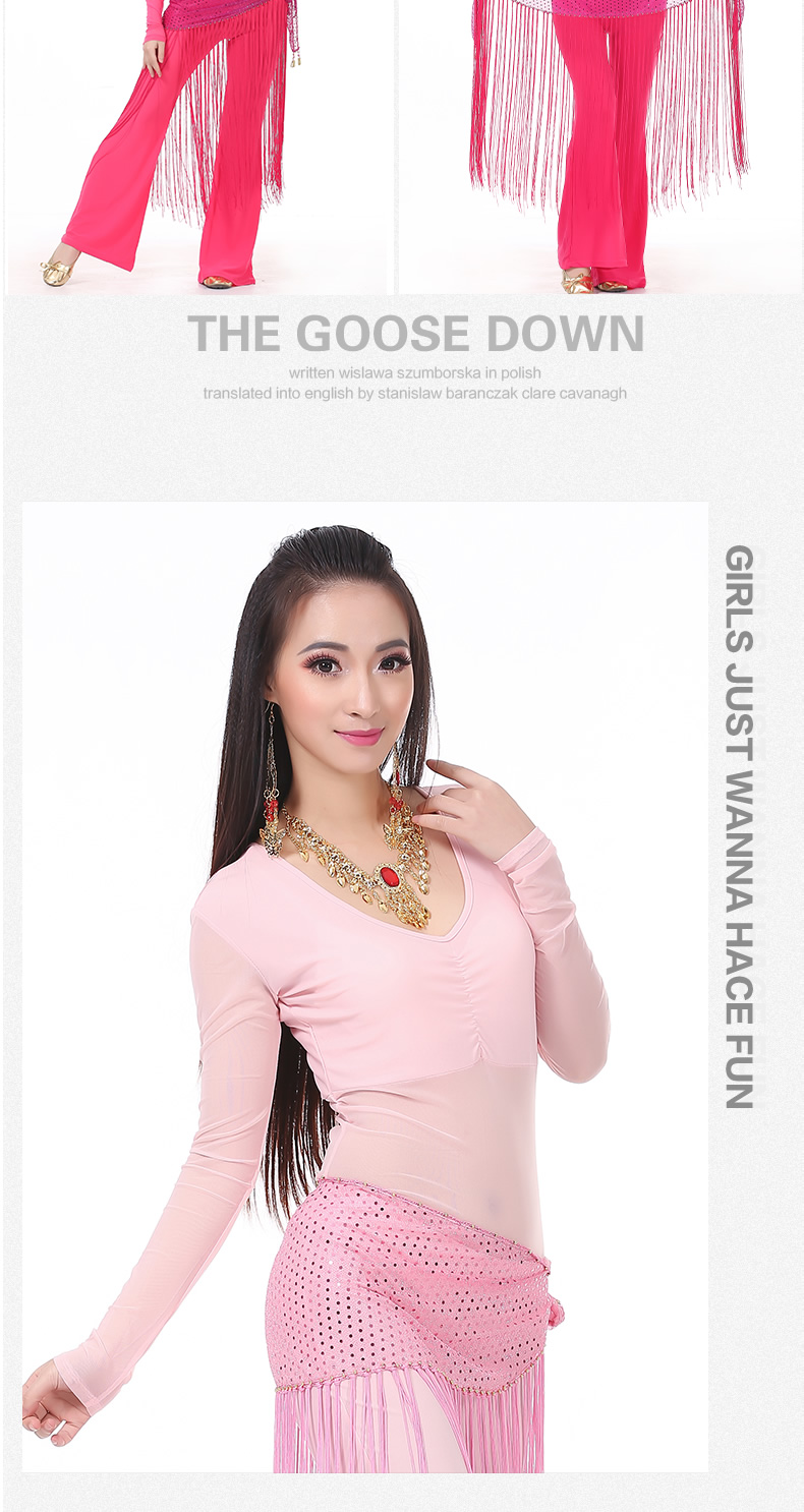 | 肚皮舞套装 >> 练习套装 >> 中皱半透纱长袖+练习裤+亮点流苏腰链(三件套) |