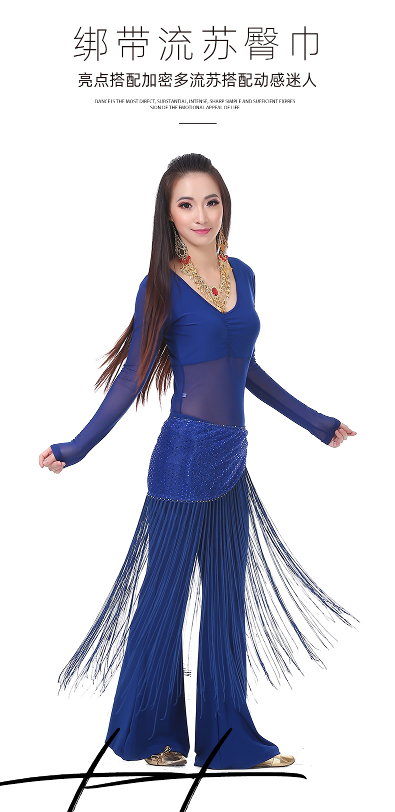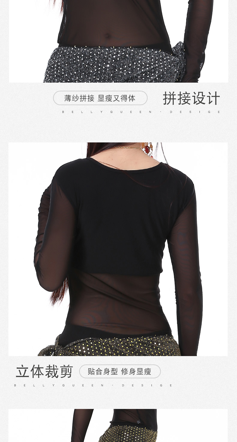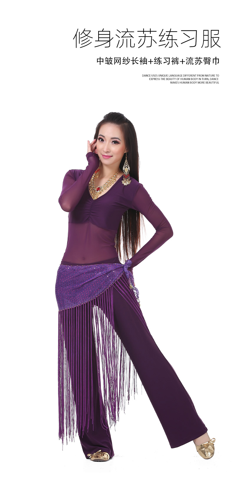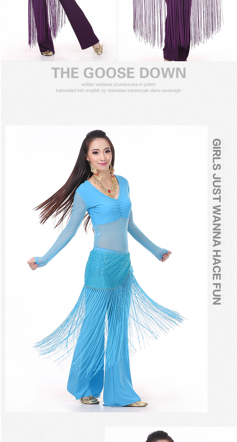 | 肚皮舞套装 >> 练习套装 >> 中皱半透纱长袖+练习裤+亮点流苏腰链(三件套) |